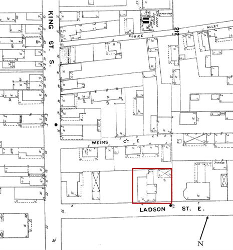 The Hayne house, 1902. George B. Edwards bought today's 2 Ladson, 4 Ladson, and 30 King Street in 1890, and cooperated with City Council to have Ladson Court extended to King Street in 1893. He relocated the Hayne house northward, and made it his residence. The 26' wide street was then laid through the empty lot. |