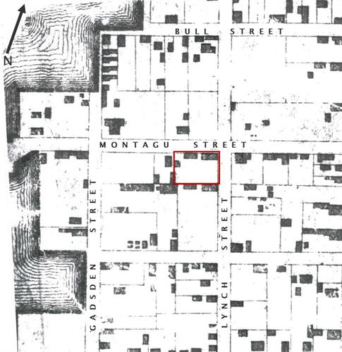 The property purchased by W. A. Courtenay in 1870 was described as a lot measuring 147' on Montagu Street, and 125' on Lynch [Ashley Avenue], with buildings. This 1872 map depicts the east façade of 95 Ashley Avenue. |