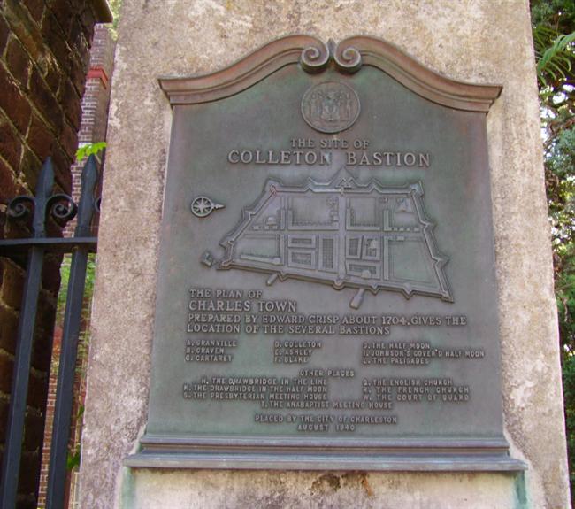 The 1711 Crisp Map shows Vanderhorst’s Creek (M), Granville Bastion (A) and Ashley Bastion (E) connected by a palisade across the narrow tributary, and Colleton Bastion (D) north of Meeting Street.